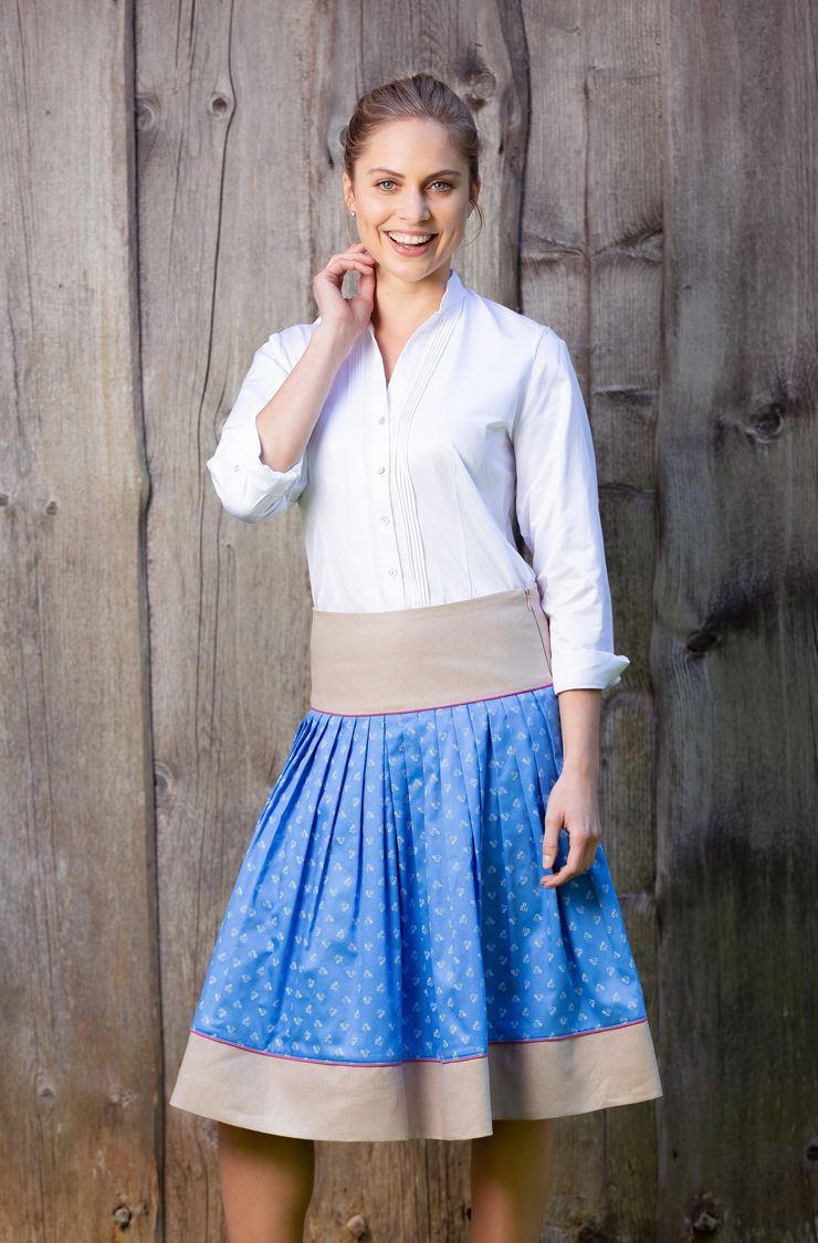 Trachtenrock Kathi hellblau weiß geblümt, beiges Leinen